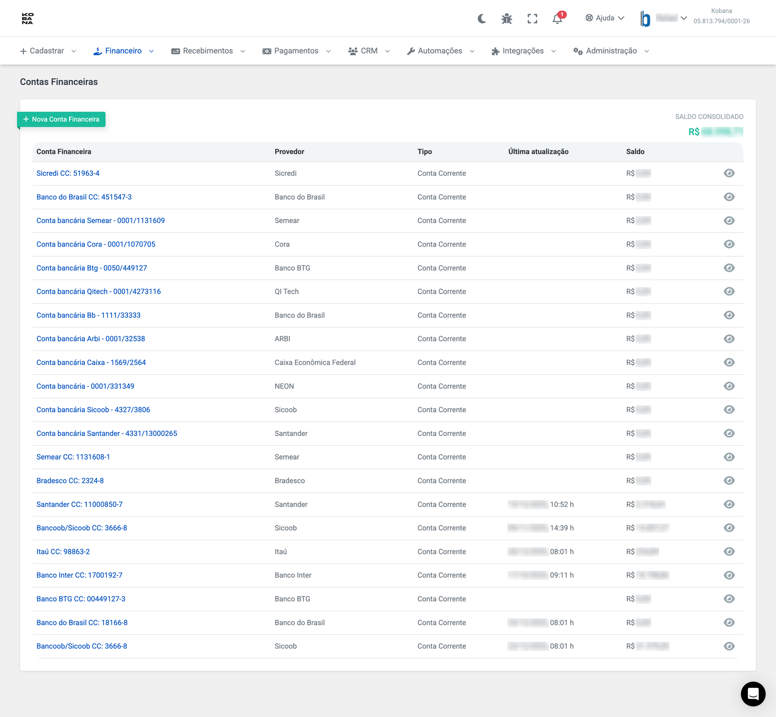 Visualize o saldo de cada filial separadamente e consolide a posição de caixa do grupo em tempo real.